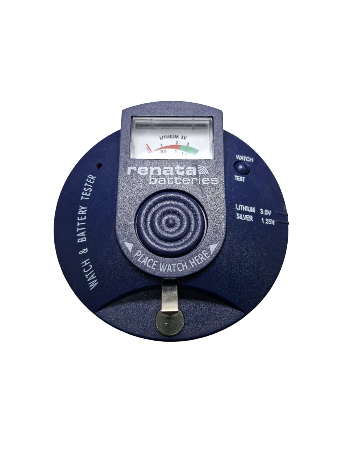 Captador de impulsos para probar el funcionamiento del movimiento. Además posee probador de pilas 1.5 y 3.0 volts.